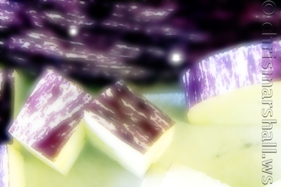 I started wth something that I thought was more unusual in its original state, a purple aubergine, but was going to pretty difficult to be too creative with. I started off trying to show the colours in a variety of ways by slicing, chopping and dicing the aubergine. I was sort of happy with the result, but then sort of went a little crazy in photoshop.