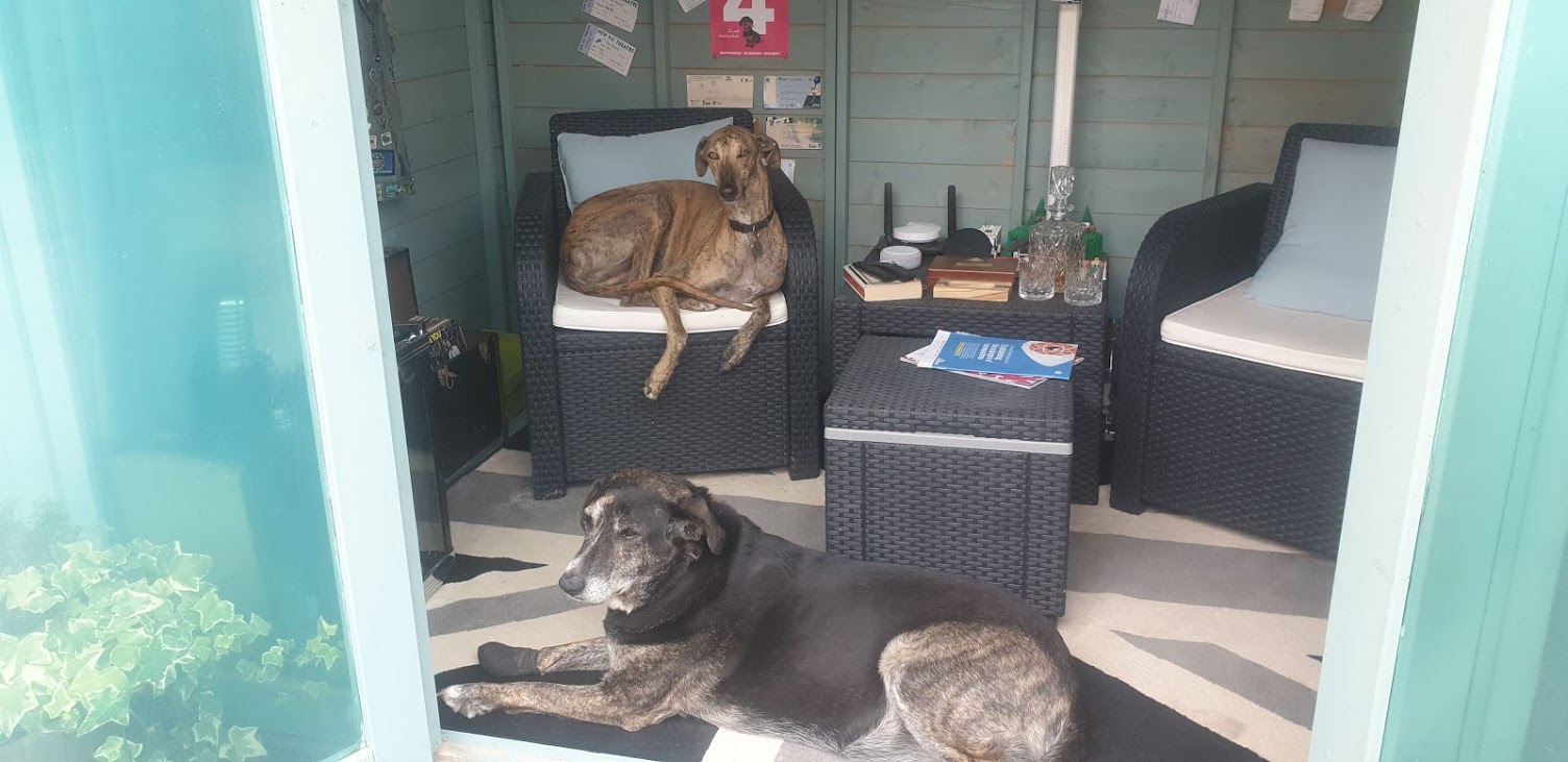 It is fair to say she has put on some weight over the years, and her paw is still not fixed BUT she does not wear a cone at all and only has it bandaged when she is out for a walk. She hops a little, but it really does not stop her enjoying life as she wants: food, sofa, dog beds, garden, beach, cannock chase, cuddle with us, time with her “family”, a visit from my parents – sorted!!