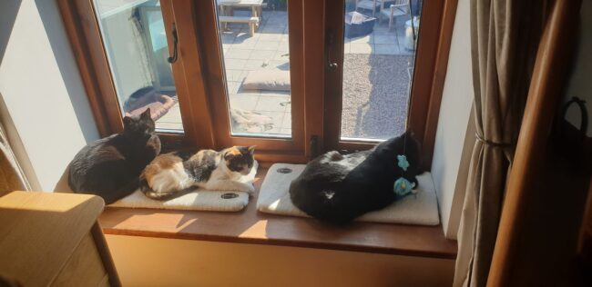 From day one he chatted away as he wanders round and you hear him long before you see him! Loves his treats, is still playful especially with his best friend Kasper but also with the Donuts and does enjoy a lie in the sun with Moreno and Fleur.